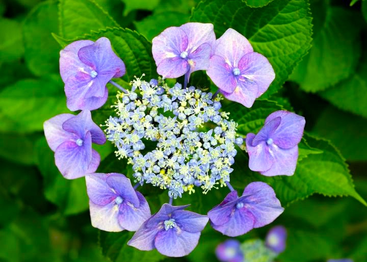 Kim Darnell reported to me this morning that while walking her dogs she’d come across a hydrangea garden with one variety she’d never seen before. With a bit of effort, I identified it as the ‘lacecap’ variety of the bigleaf, or snowball, hydrangea, Hydrangea macrophylla: