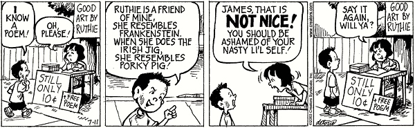 In a recent One Big Happy, Ruthie’s father tries to get her to play with tongue twisters, but she treats the texts as stories about events in a real world: