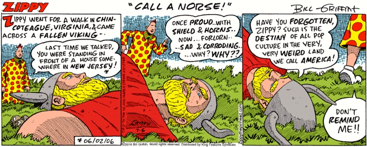 July 6, 2016In today’s Zippy, Bill Griffith continues his long exploration of American pop culture, especially roadside culture — diners, motels, and (very often) big fiberglass advertising figures: