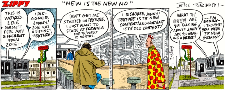 December 31, 2015Today’s Zippy has Griffy and Zippy together for New Year’s Eve, apparently in Coney Island in 1951, though their minds seem to be in the present day (Griffy’s looking forward to 2016, and Zippy’s annoyed with Justin Bieber, as he often is):