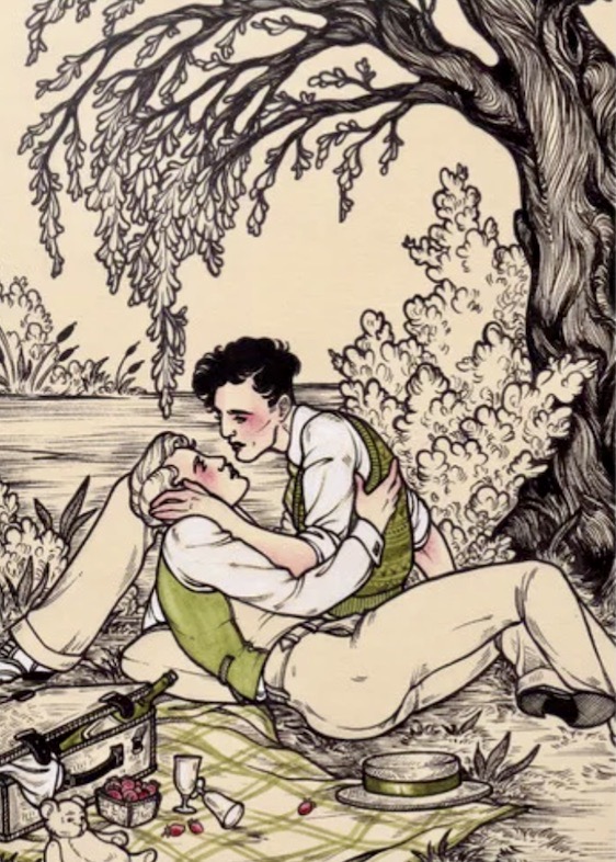 (#1) Packed with further details worthy of comment, among them: the dark-light (paired with dominant-submissive) contrast of the two men, the overarching U of the tree’s branches complementing the cupped U of the submissive man’s body, the red of the strawberries against a mostly b&w composition, the stuffed bear, the vibrant green of the men’s sweaters, the neck of the wine bottle poking out from the confines of the picnic hamper, the phallic reeds on the far shore of the lake