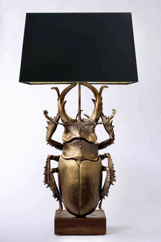 Dallas based sculptor George Sellers studied in Italy, where he was trained in the traditional methods by a master carver. He creates seductively Gothic home furnishings and objets using plaster and bronze as his primary mediums. … large staghorn beetle sculpture table lamp cast in solid bronze on a walnut base, designed in a fine arts foundry using the lost-wax method of casting